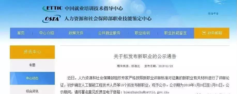 近日,人力資源和社會保障部組織專家嚴格按照新職業評審標準對征集的新職業有關材料進行了評審論證,初步確定人工智能工程技術人員等15個擬發布新職業,現予公示。公示期為2019年1月25日至1月31日。公示期間,請將署名意見反饋至電子信箱:biaozhunchu@cettic.gov.cn。