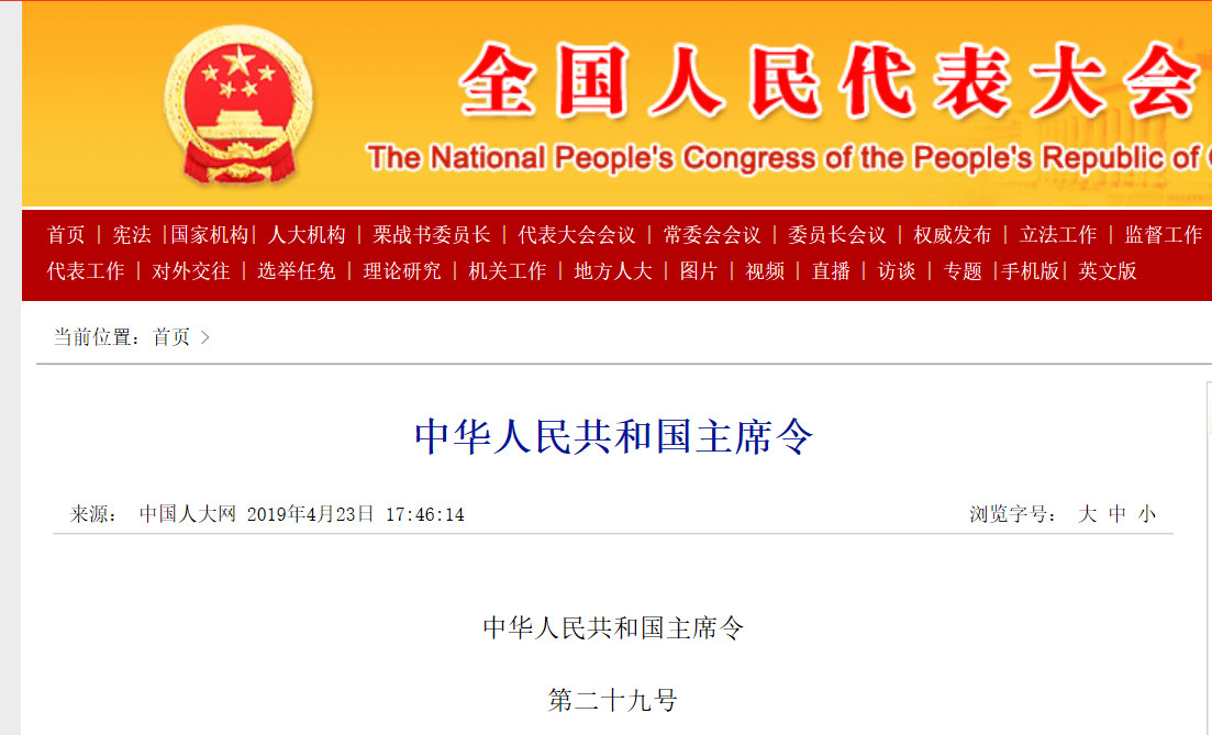 (2019年4月23日第十三屆全國人民代表大會常務委員會第十次會議通過)第十三屆全國人民代表大會常務委員會第十次會議決定: