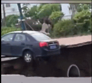 視頻顯示,路面出現(xiàn)大面積塌陷,一輛小轎車,停在塌陷坑邊緣。