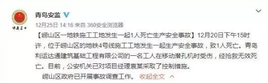 據(jù)@青島安監(jiān) 微博消息,2018年12月20日下午15時(shí)許,位于嶗山區(qū)的地鐵4號(hào)線施工工地發(fā)生一起生產(chǎn)安全事故,致1人死亡。青島利運(yùn)達(dá)通建筑基礎(chǔ)工程有限公司的一名工人在移動(dòng)潛孔機(jī)時(shí)受傷,經(jīng)搶救無(wú)效死亡。