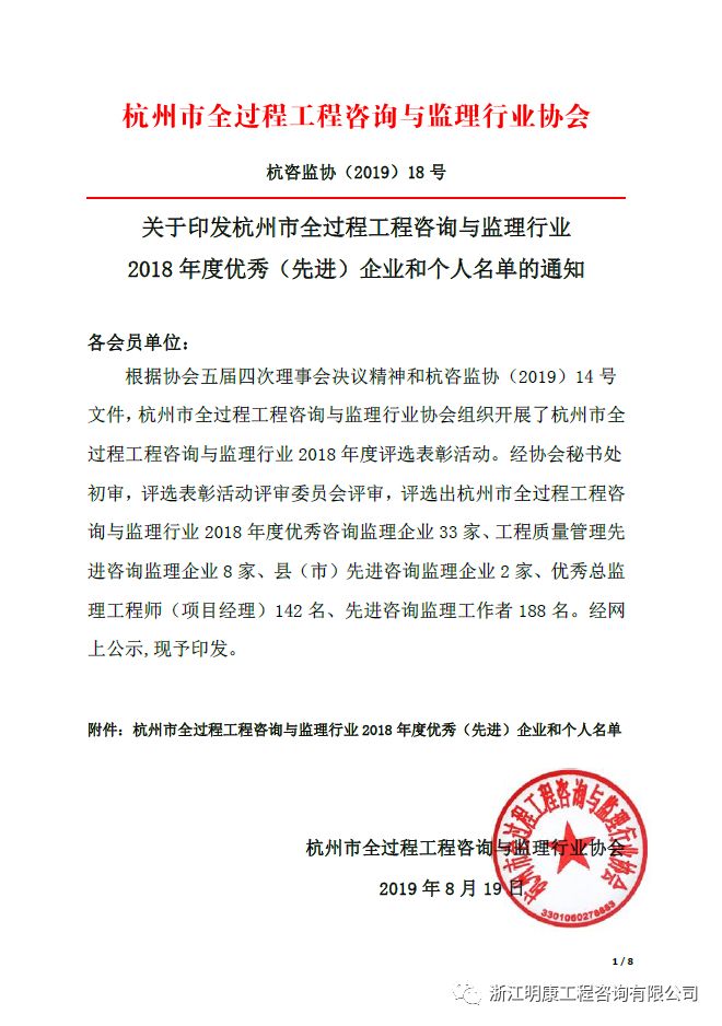 公司榮譽 | 明康咨詢榮獲杭州市全過程工程咨詢與監理行業2018年度優秀咨詢監理企業稱號發布日期:2019-08-21