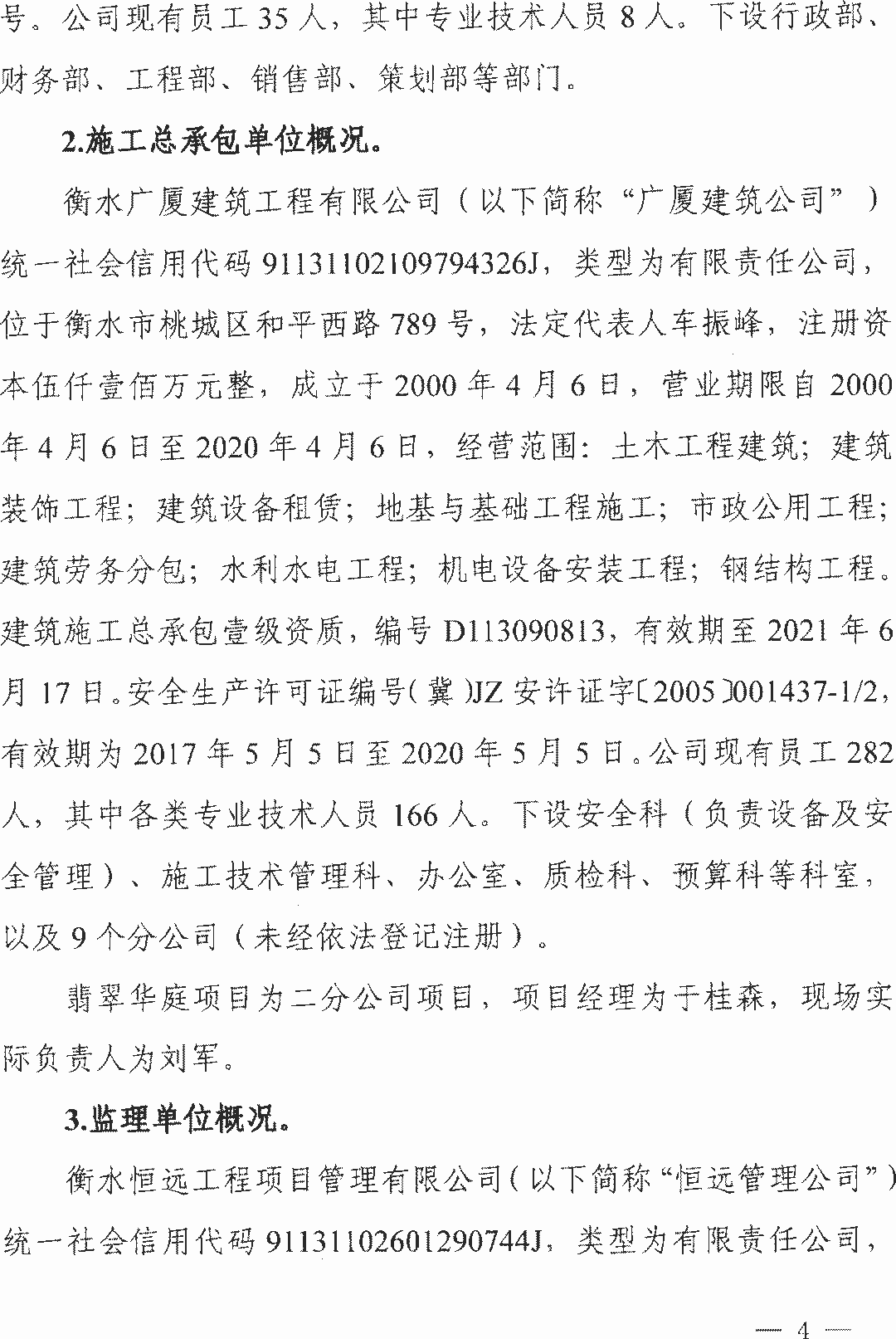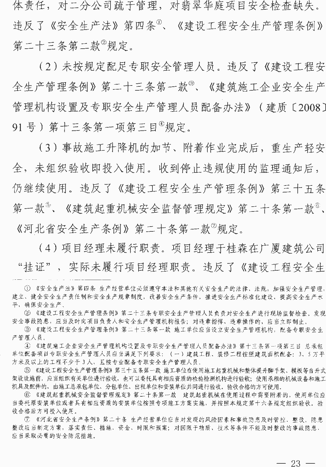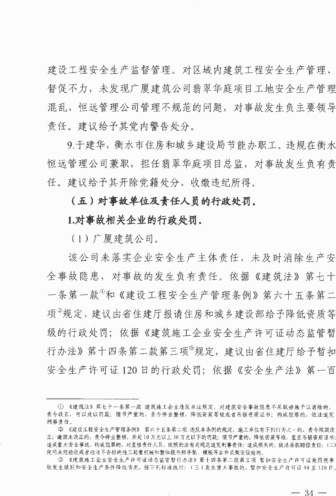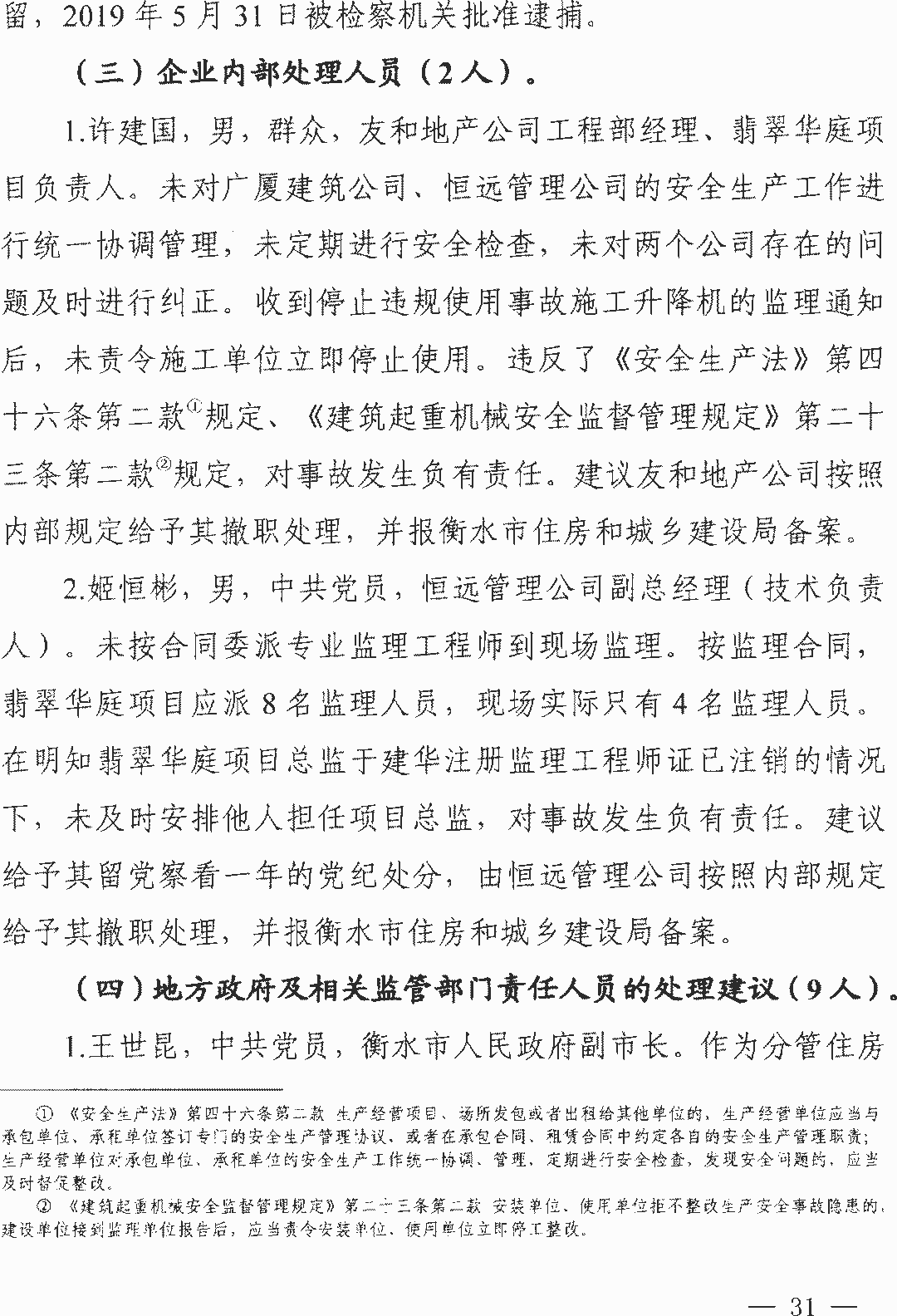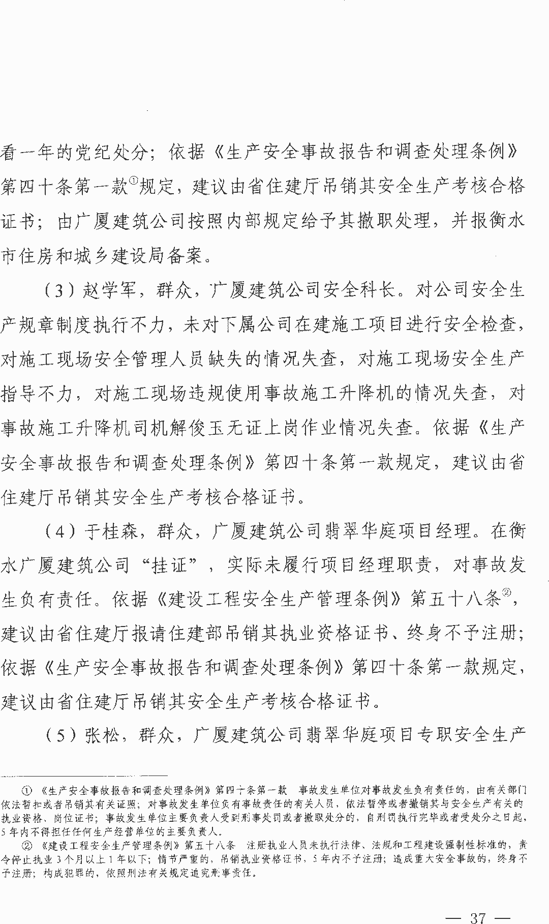 于桂森,翡翠華庭項(xiàng)目經(jīng)理,在衡水廣廈建筑公司“掛證”,建議吊銷執(zhí)業(yè)資格證書、終身不予注冊(cè),建議吊銷安全生產(chǎn)考核合格證書,已被檢察機(jī)關(guān)批準(zhǔn)逮捕。