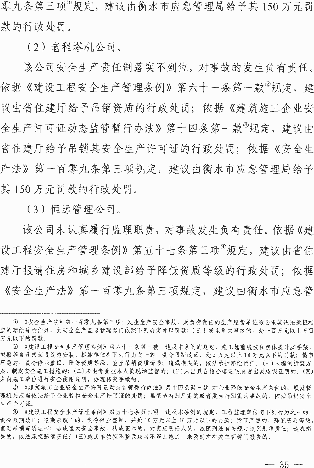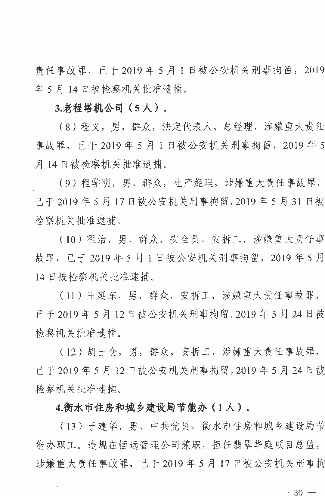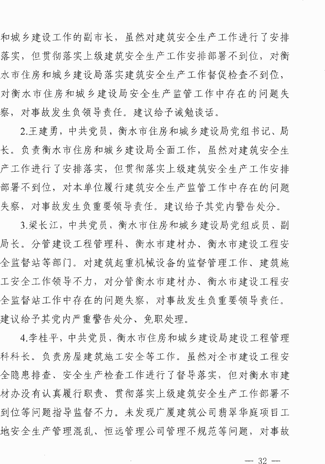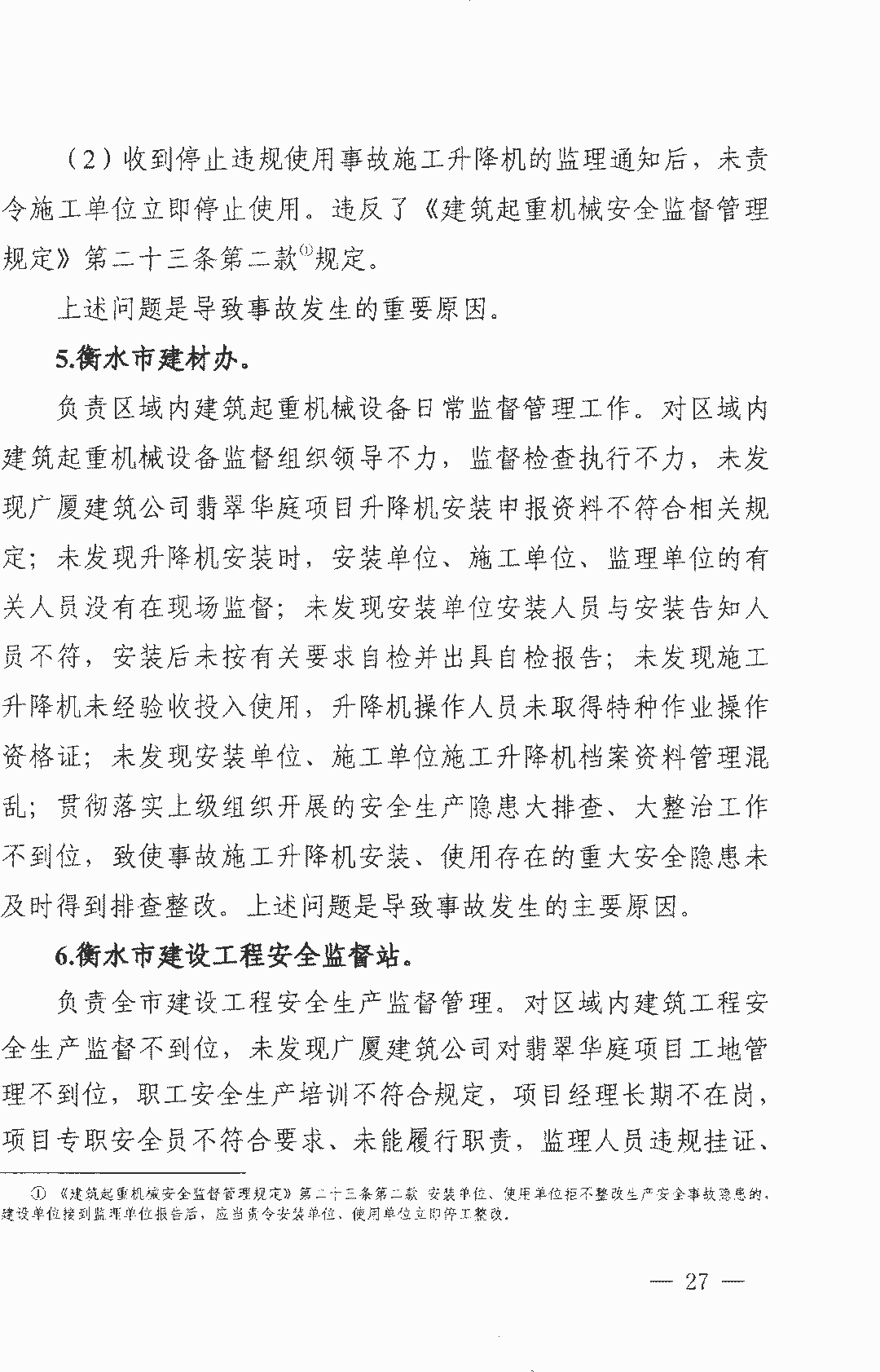 于桂森,翡翠華庭項(xiàng)目經(jīng)理,在衡水廣廈建筑公司“掛證”,建議吊銷執(zhí)業(yè)資格證書、終身不予注冊(cè),建議吊銷安全生產(chǎn)考核合格證書,已被檢察機(jī)關(guān)批準(zhǔn)逮捕。