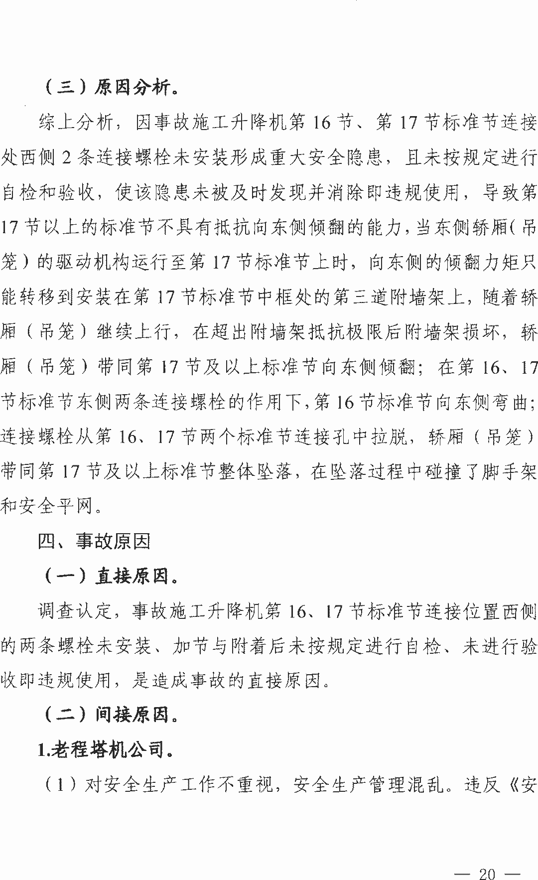 近日,河北省安全生產(chǎn)委員會(huì)辦公室公布了調(diào)查結(jié)果,讓人唏噓不已的是,僅僅是因?yàn)?節(jié)升降機(jī)標(biāo)準(zhǔn)節(jié)處的2條螺栓未安裝,就造成了11人殞命的結(jié)局。