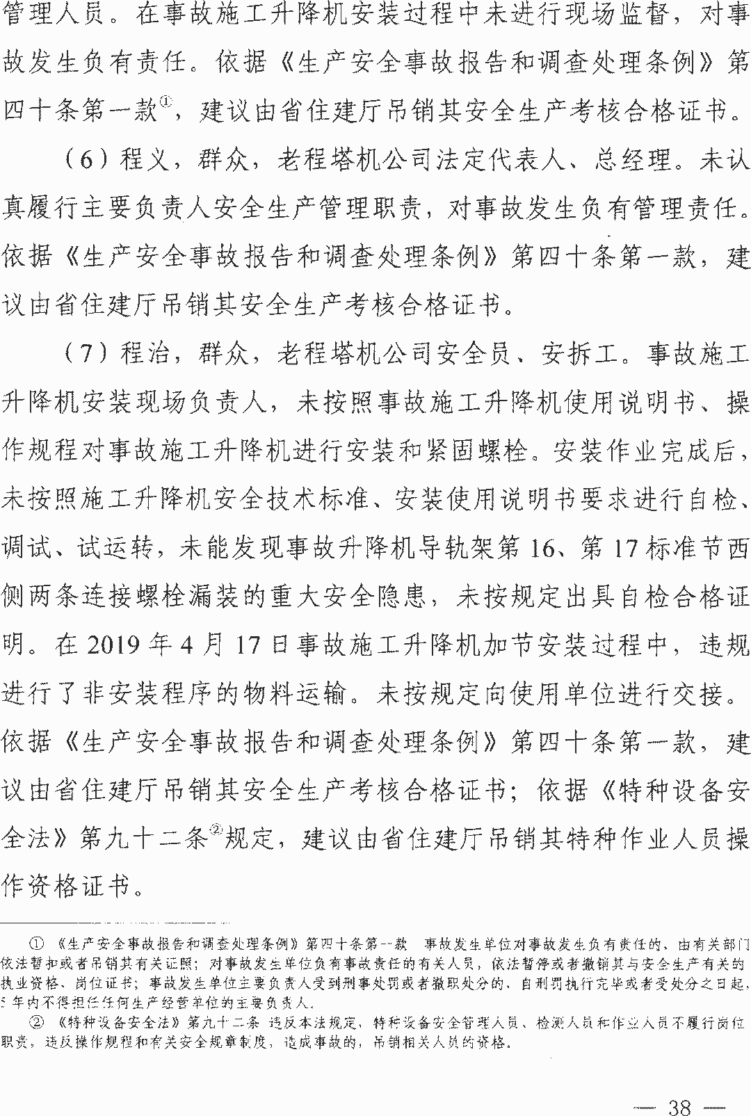 程治,安全員、安拆工,建議吊銷特種作業(yè)人員操作資格證書,已被檢察機(jī)關(guān)批準(zhǔn)逮捕。