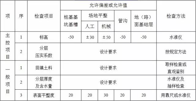 2、填方施工結束后,應檢查標高、邊坡坡度、壓實程度等,檢驗標準應符合下表的規定。